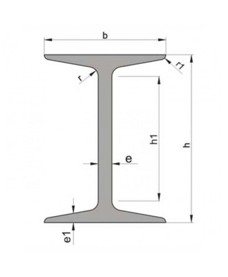 | Dimensió h | Dimensió b | Dimensió e=r | Dimensió e1 | Dimensió r1 | Dimensió h1 | Secció (cm²) | Pes (Kg/m) |